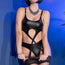 Erotisches Set aus weichem und lederähnlichem Material in schwarz. Ein Oberteil mit verstellbaren Trägern und Strumpfhaltern. Dazu ein String mit offenem Schritt und passende Netzstrümpfe mit floralem Spitzensaum. Hochwertige Silikonpeitsche inklusive.